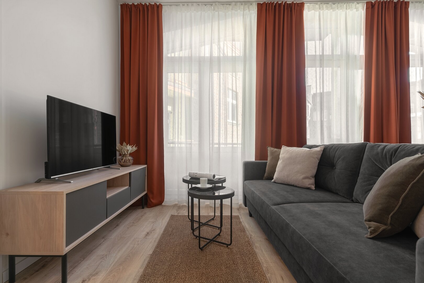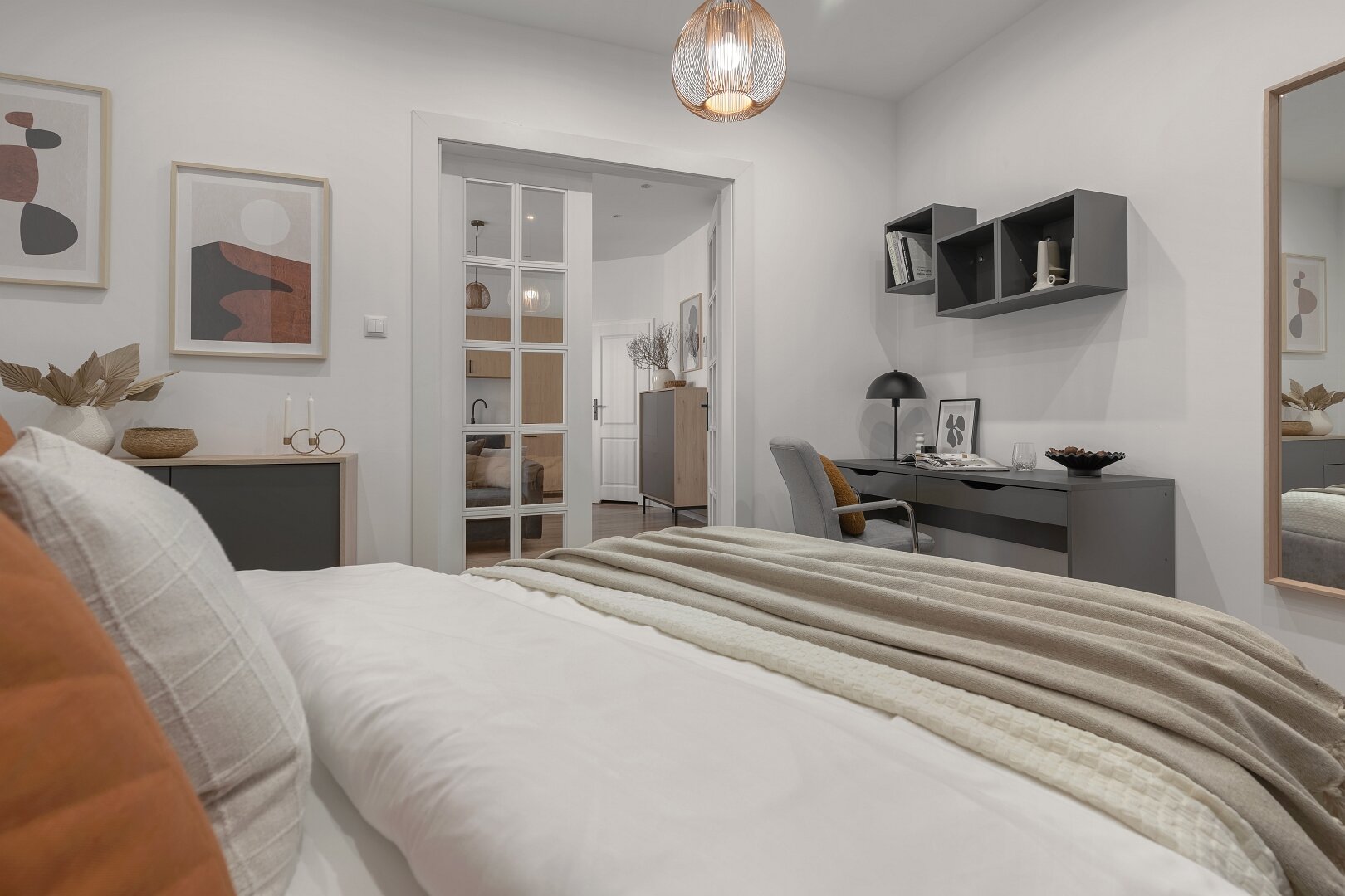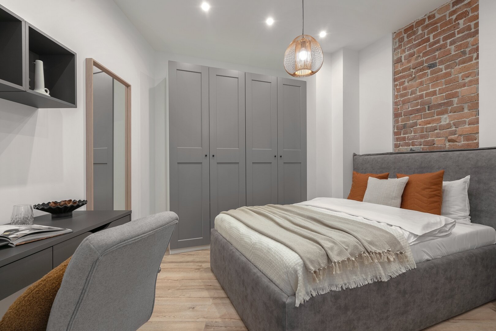 Niemal monochromatyczny apartament gdyby nie czerwone akcenty nadające temperamentu. Jeden z nielicznych wyposażony w klasyczne, podwójne łóżko.