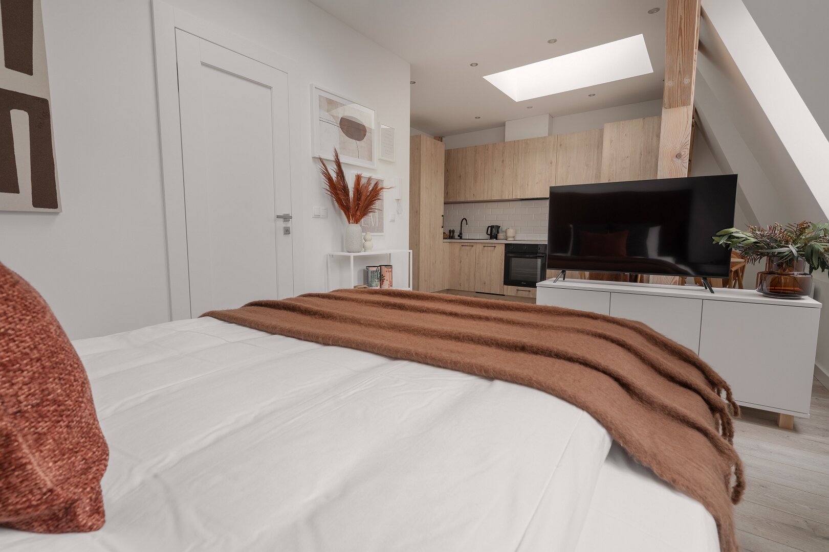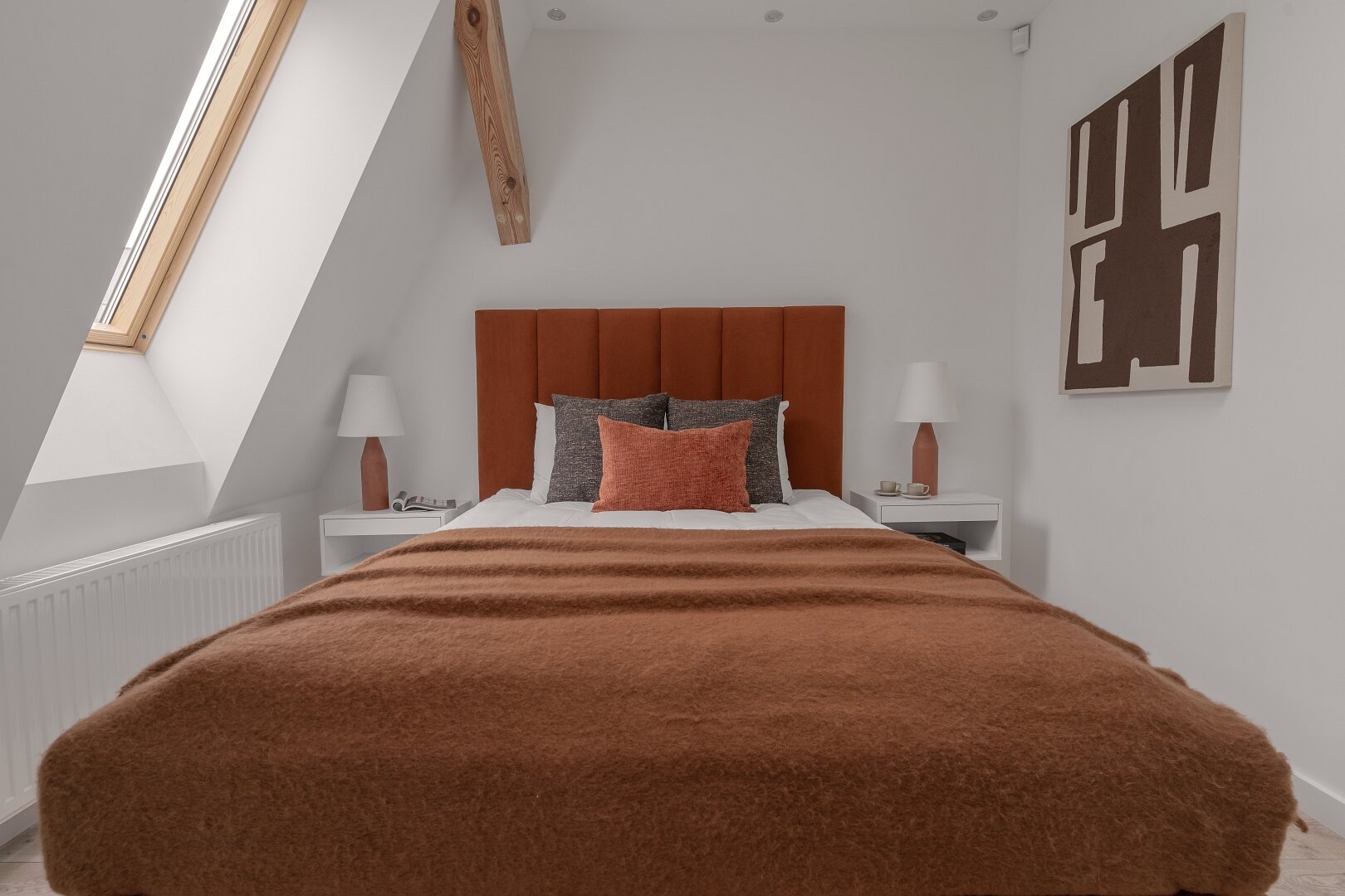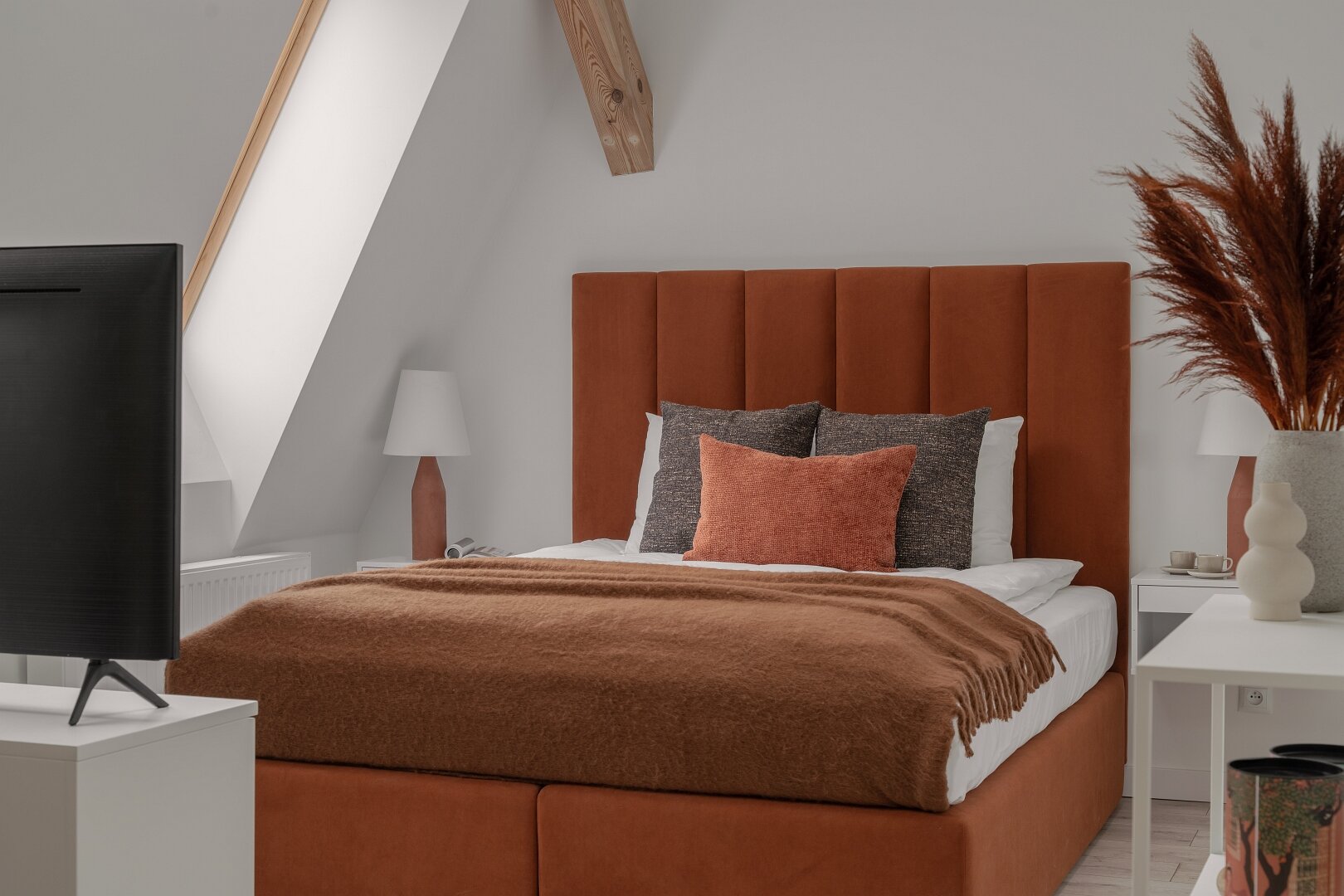 Niemal monochromatyczny apartament gdyby nie czerwone akcenty nadające temperamentu. Jeden z nielicznych wyposażony w klasyczne, podwójne łóżko.