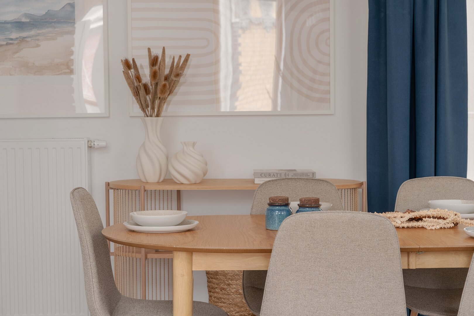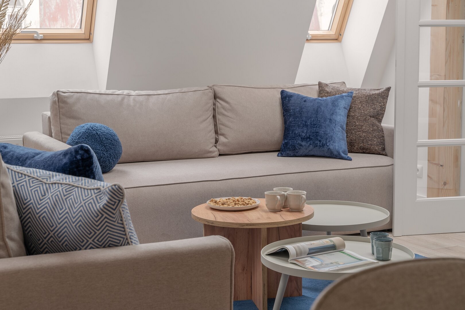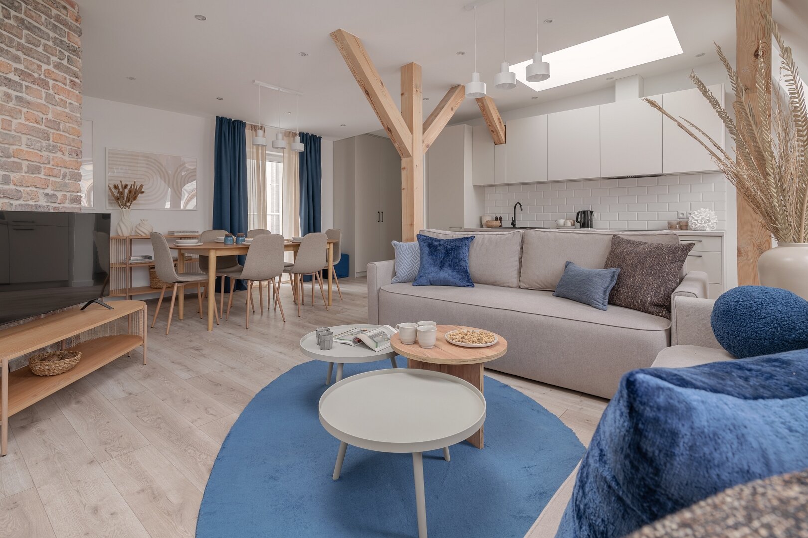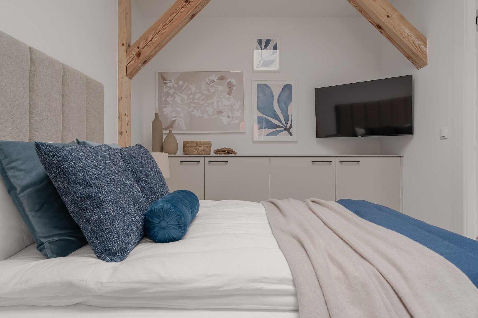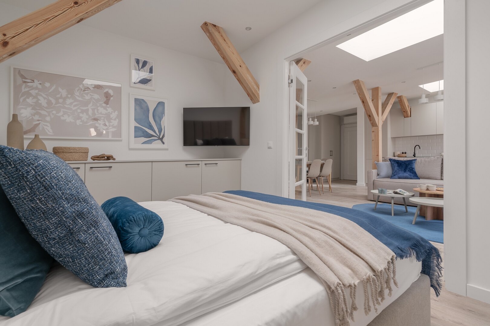 W środku znajdziesz odważne połączenie kolorystyczne, ale wciąż pozostaje tu spokojnie. Odrębna sypialnia ułatwi organizacje, więc jest to świetny wybór na kilka dni.