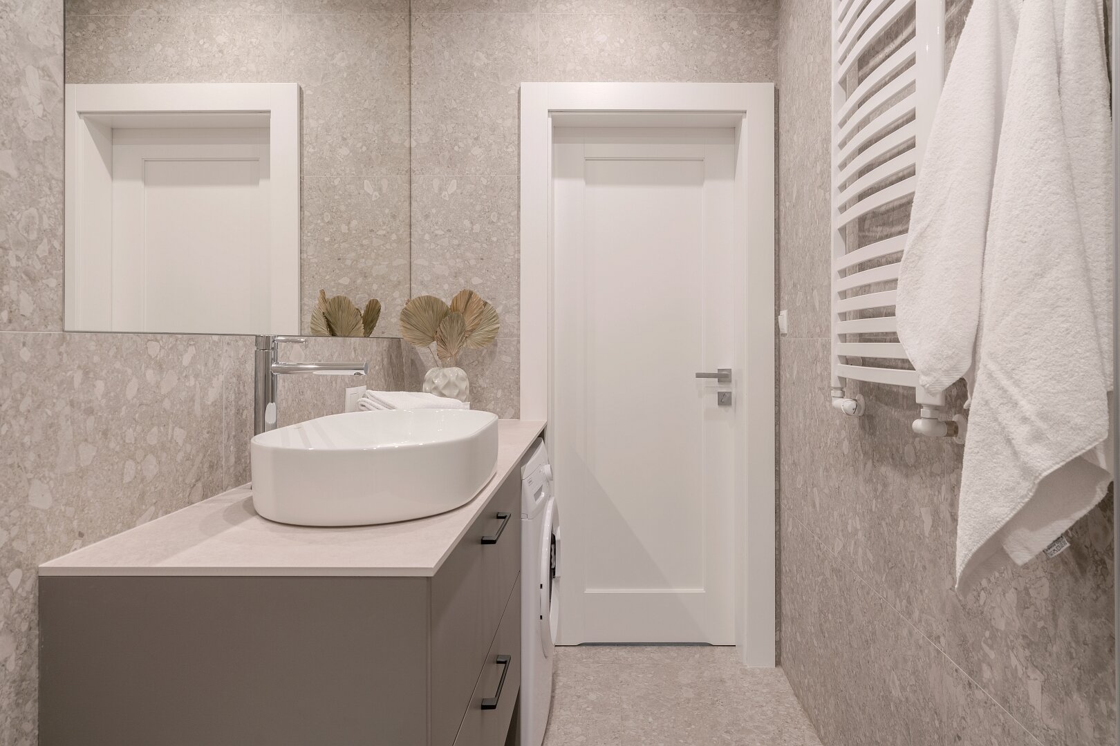 Niemal monochromatyczny apartament gdyby nie czerwone akcenty nadające temperamentu. Jeden z nielicznych wyposażony w klasyczne, podwójne łóżko.