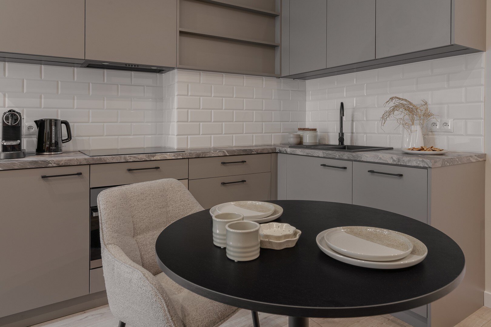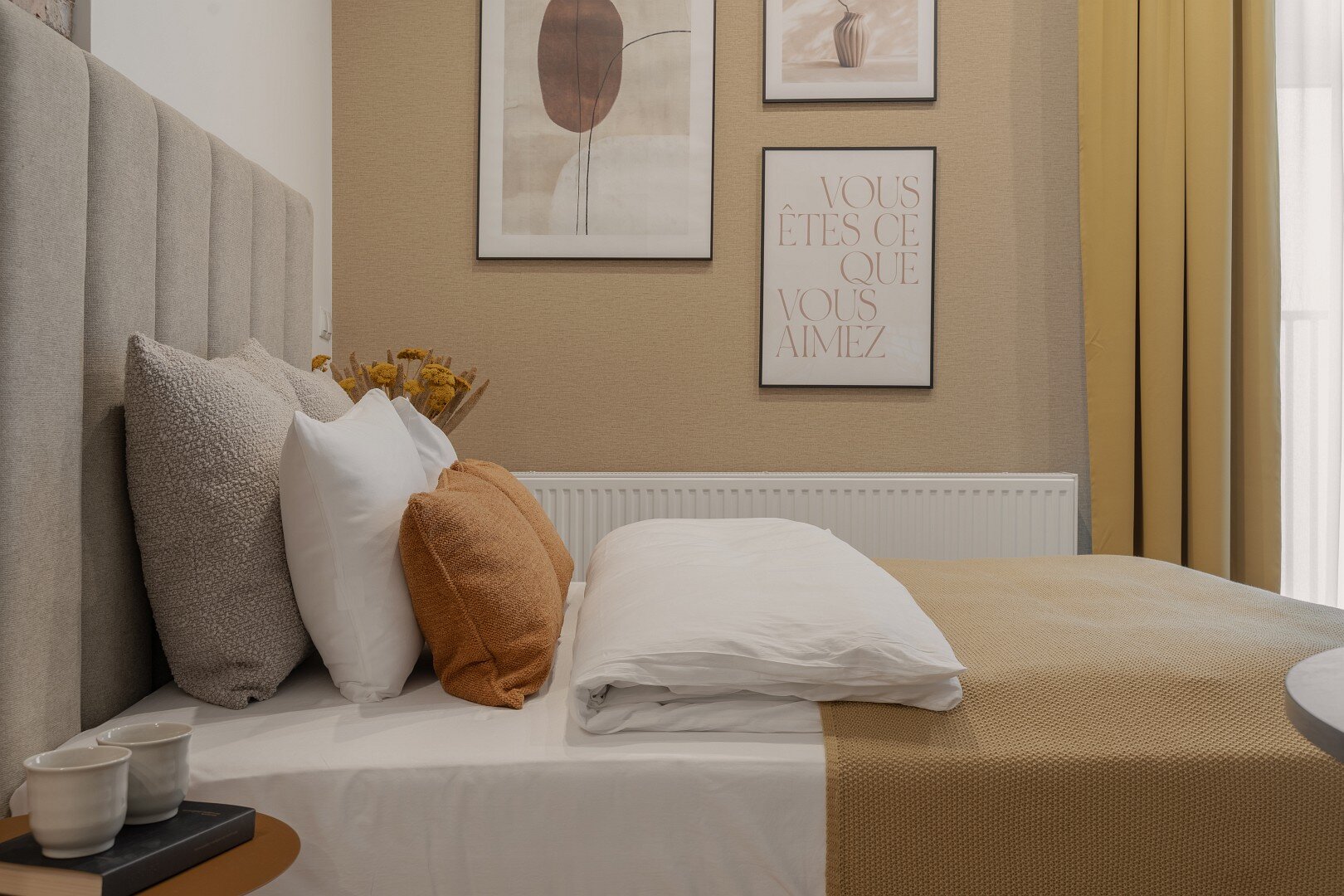 Jasne wnętrze z akcentami w odcieniach beżu i musztardy wprowadza spokój i harmonię, a ściana z naturalnej cegły dodaje mu charakteru i niepowtarzalnego klimatu. W przestronnym pokoju znajdziesz wygodne łóżko z miękkim zagłówkiem, idealne na relaks po dniu pełnym wrażeń. Obok znajduje się część jadalniana z okrągłym stołem – idealna na poranną kawę lub romantyczną kolację we dwoje. Nowoczesny aneks kuchenny został w pełni wyposażony, abyś mógł poczuć się jak w domu – jest tu ekspres do kawy Nespresso, czajnik, płyta grzewcza i niezbędne naczynia.