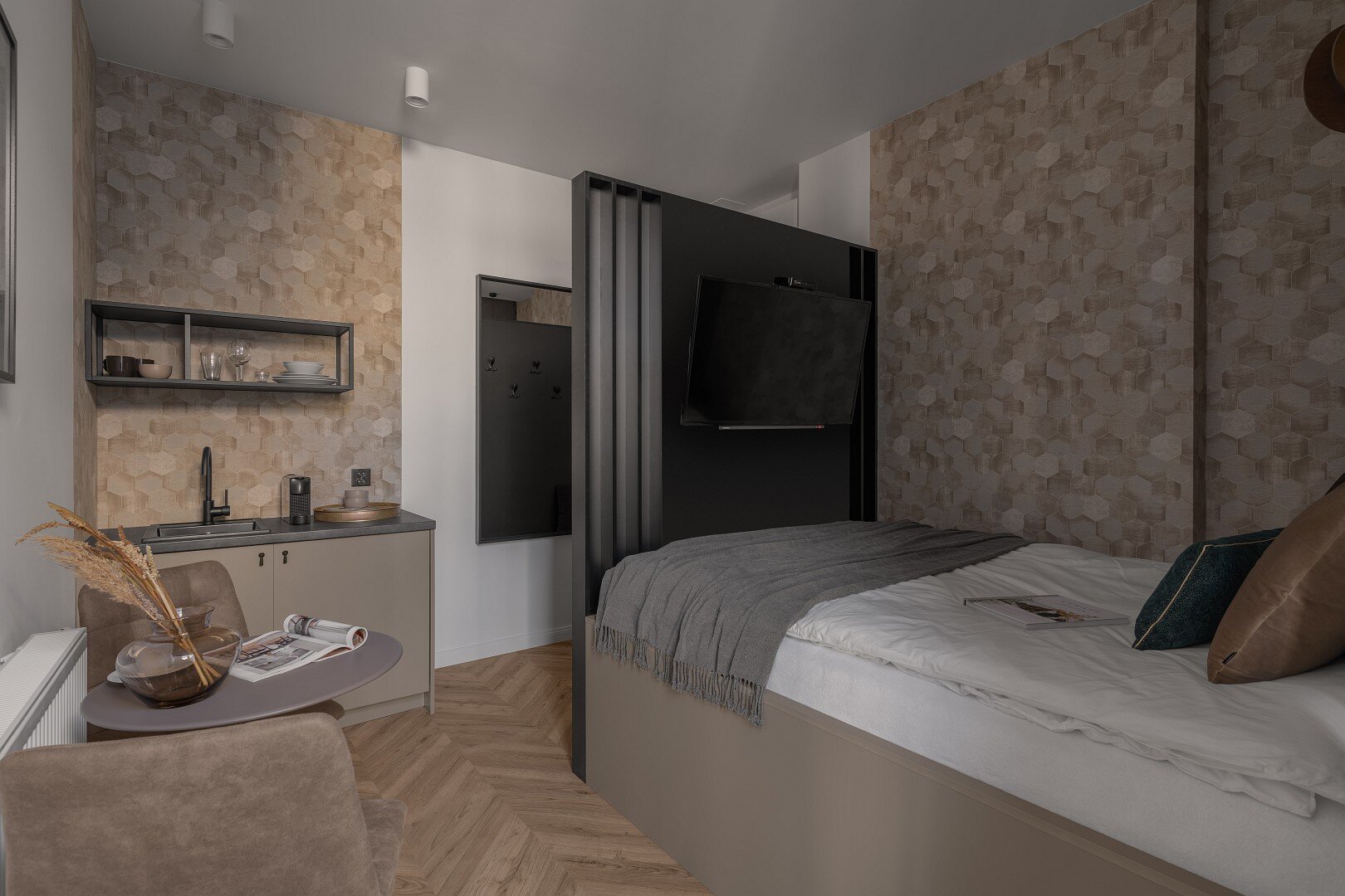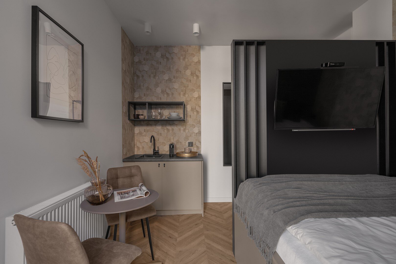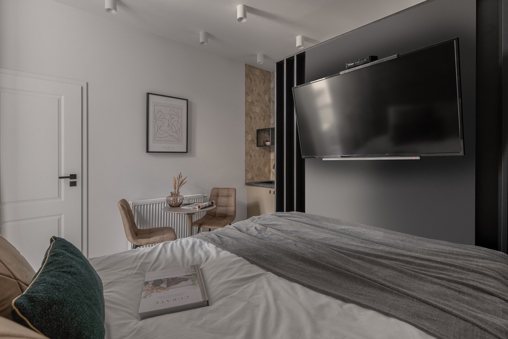 We wnętrzu pokoju czeka na Ciebie wysoka zabudowa łóżka z wygodnym materacem i tapicerowanym zagłówkiem. Naprzeciwko znajduje się Smart TV, który umili niejeden wieczór, a w dalszej części czeka niewielki aneks kuchenny z ekspresem do kawy Nespresso oraz podstawowymi przyborami kuchennymi.