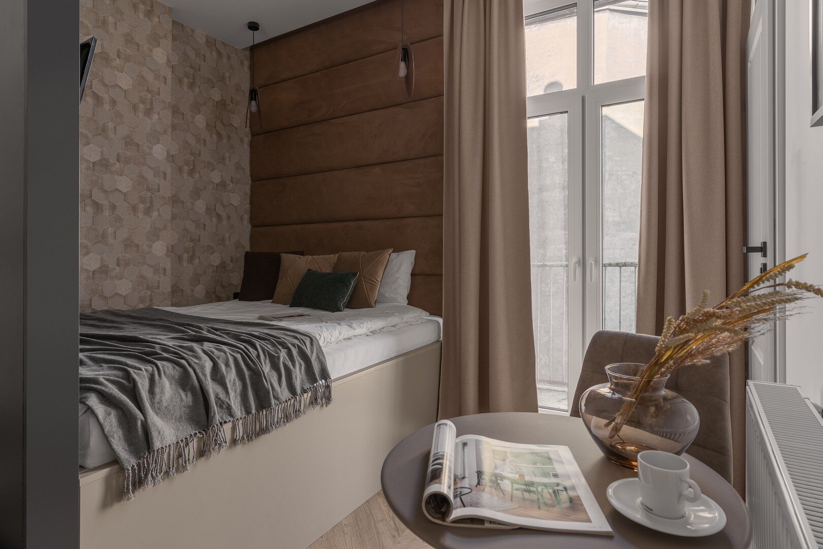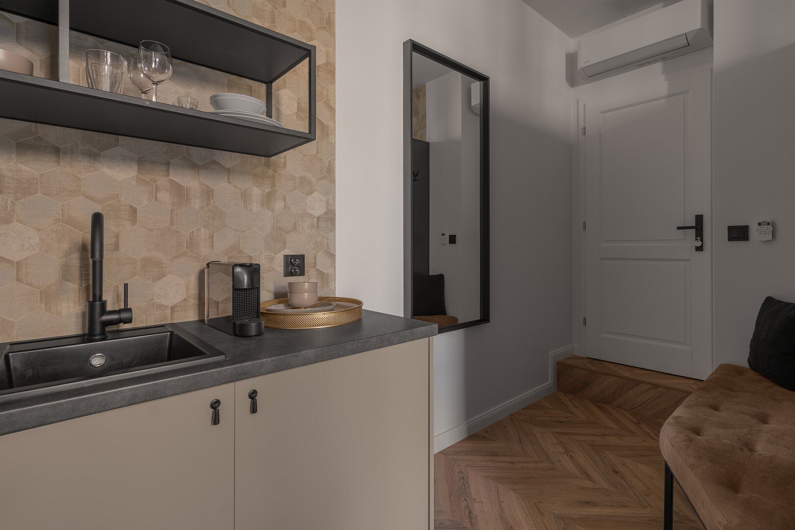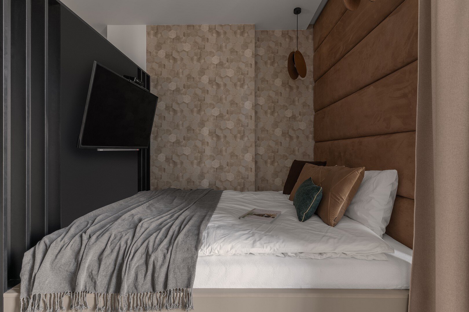 We wnętrzu pokoju czeka na Ciebie wysoka zabudowa łóżka z wygodnym materacem i tapicerowanym zagłówkiem. Naprzeciwko znajduje się Smart TV, który umili niejeden wieczór, a w dalszej części czeka niewielki aneks kuchenny z ekspresem do kawy Nespresso oraz podstawowymi przyborami kuchennymi.