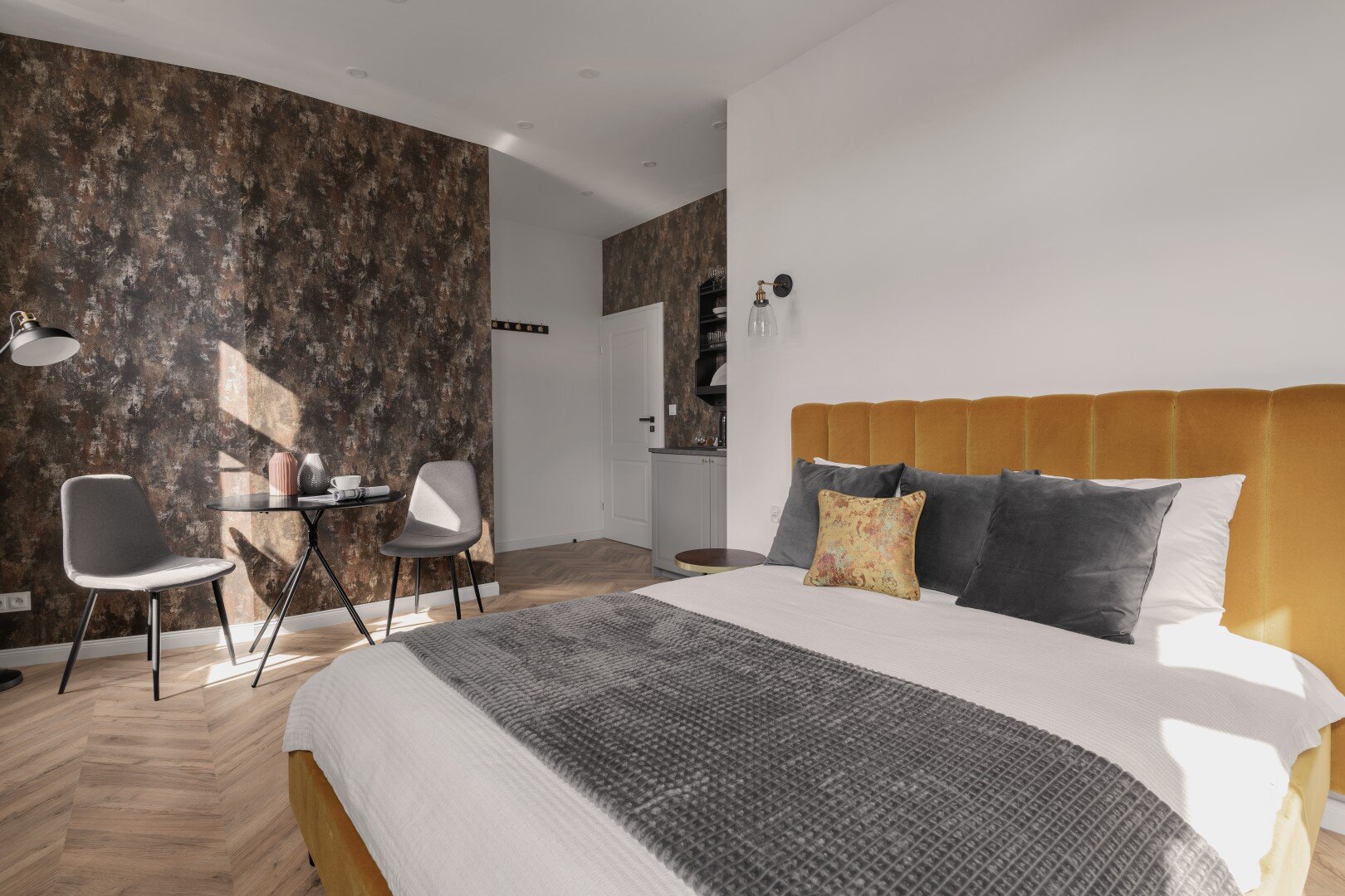 We wnętrzu pokoju czeka na Ciebie klasyczne, dwuosobowe łóżko z wygodnym materacem. Naprzeciwko znajduje się Smart TV, który umili niejeden wieczór, a w dalszej części czeka niewielki aneks kuchenny z ekspresem do kawy Nespresso oraz podstawowymi przyborami kuchennymi.