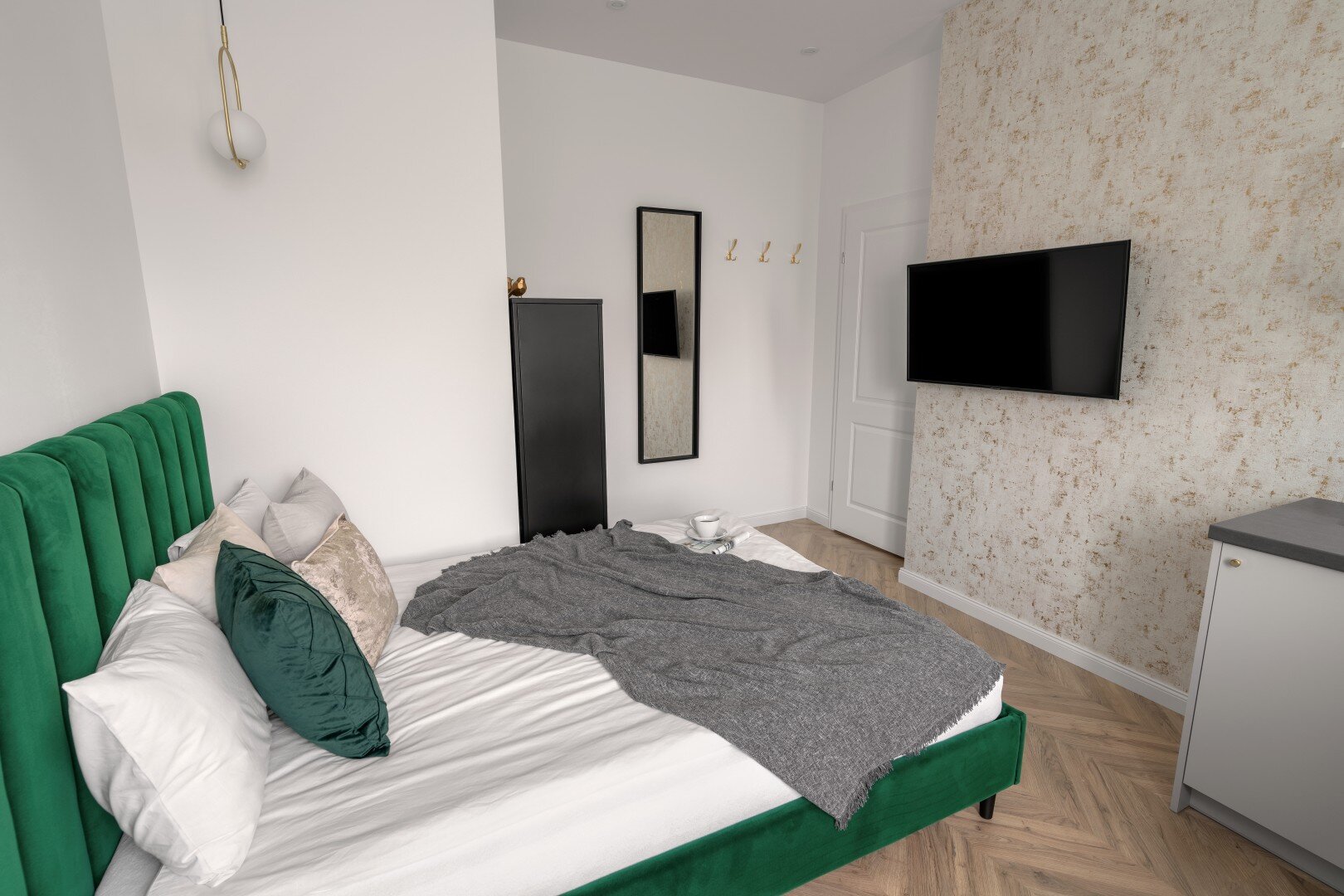 We wnętrzu pokoju czeka na Ciebie klasyczne, dwuosobowe łóżko z wygodnym materacem. Naprzeciwko znajduje się Smart TV, który umili niejeden wieczór, a w dalszej części czeka niewielki aneks kuchenny z ekspresem do kawy Nespresso oraz podstawowymi przyborami kuchennymi.