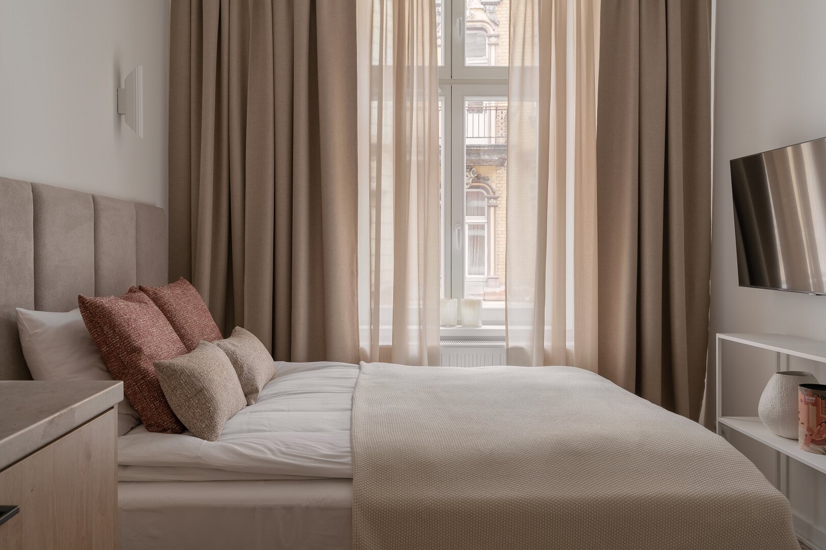 Niemal monochromatyczny apartament gdyby nie czerwone akcenty nadające temperamentu. Jeden z nielicznych wyposażony w klasyczne, podwójne łóżko.