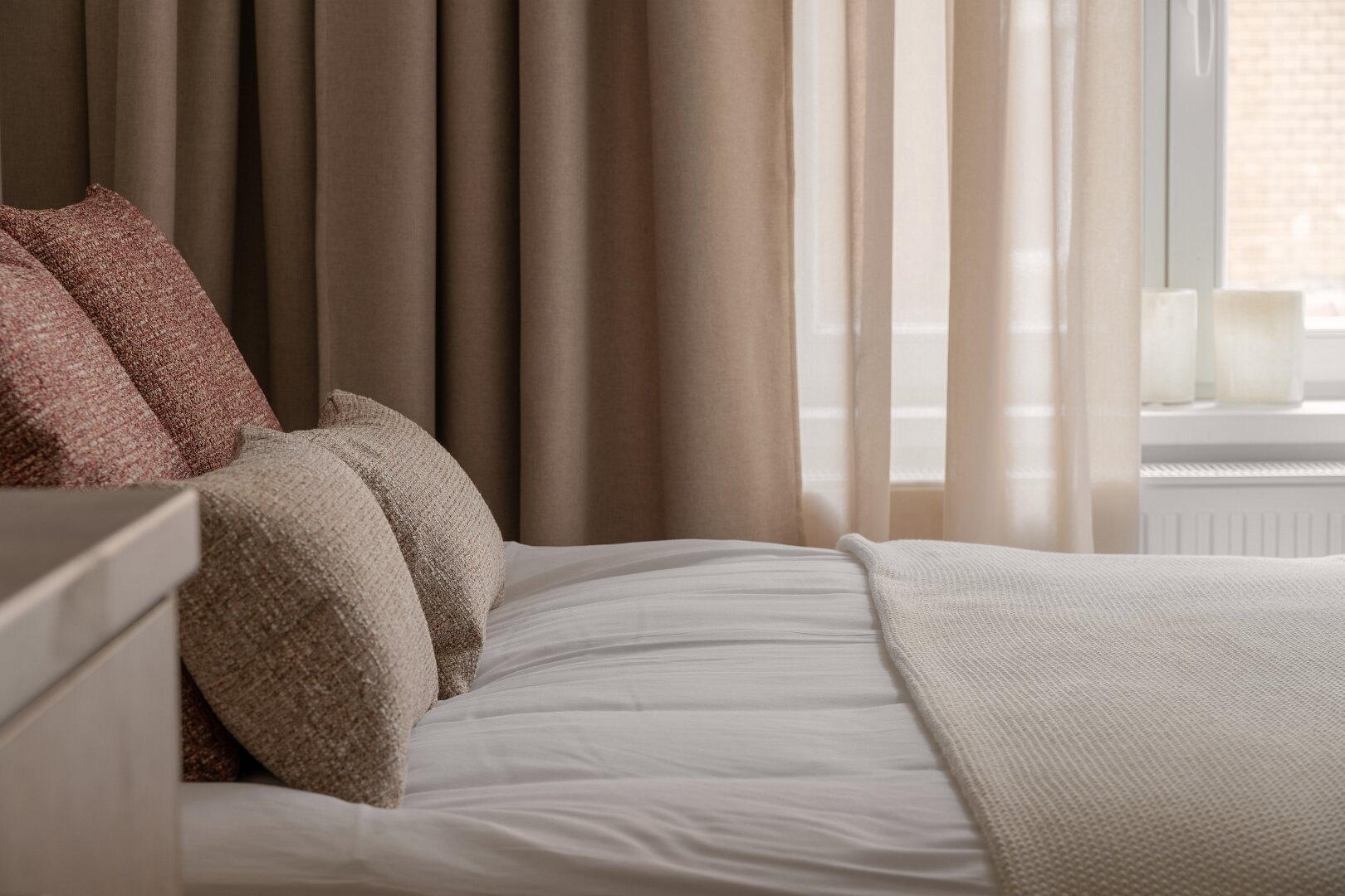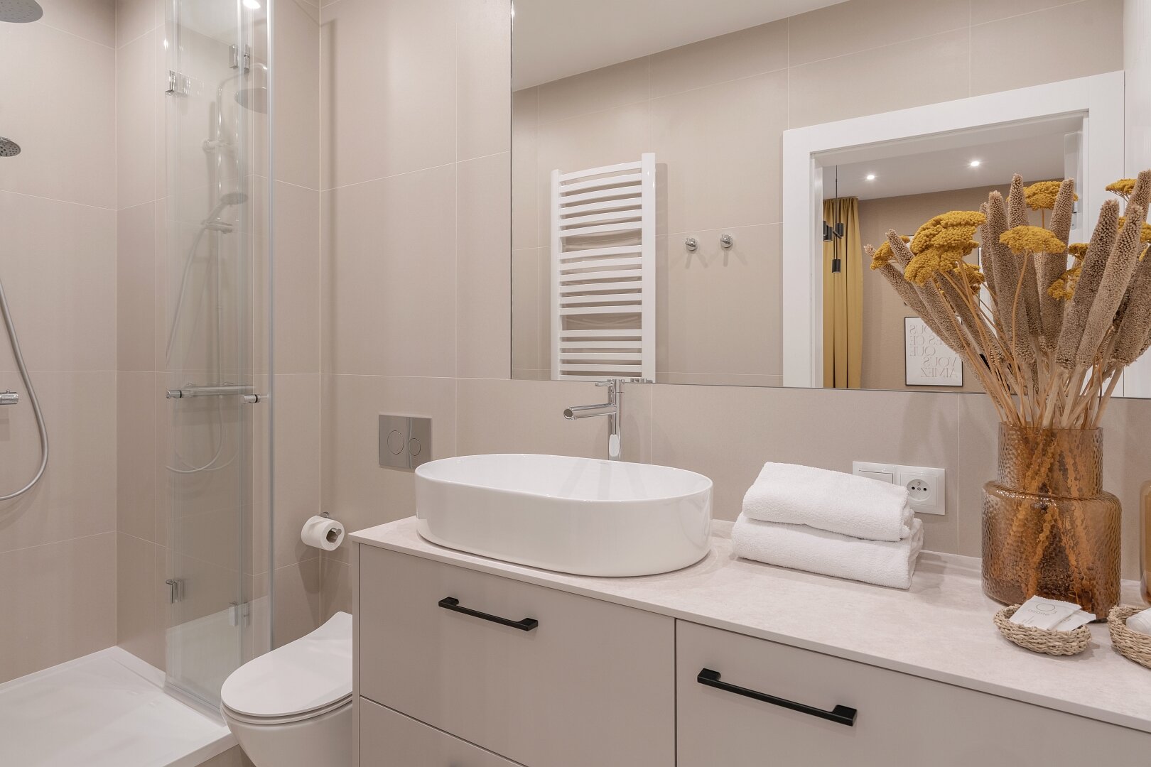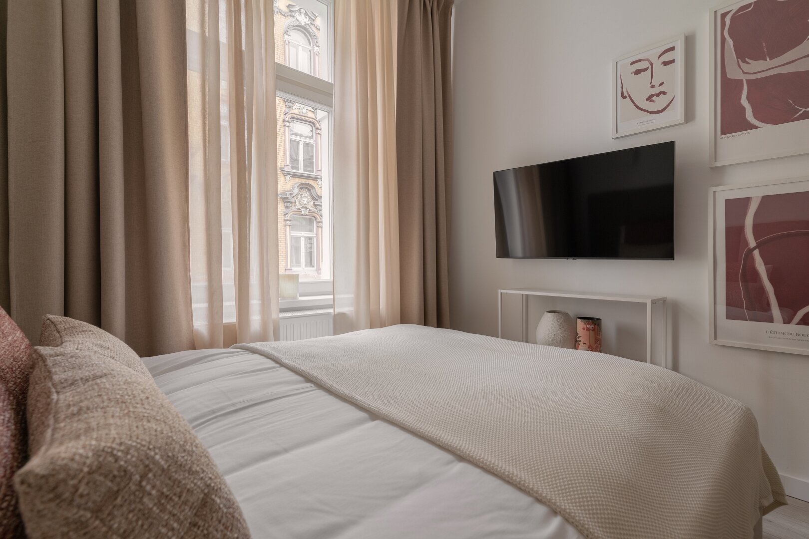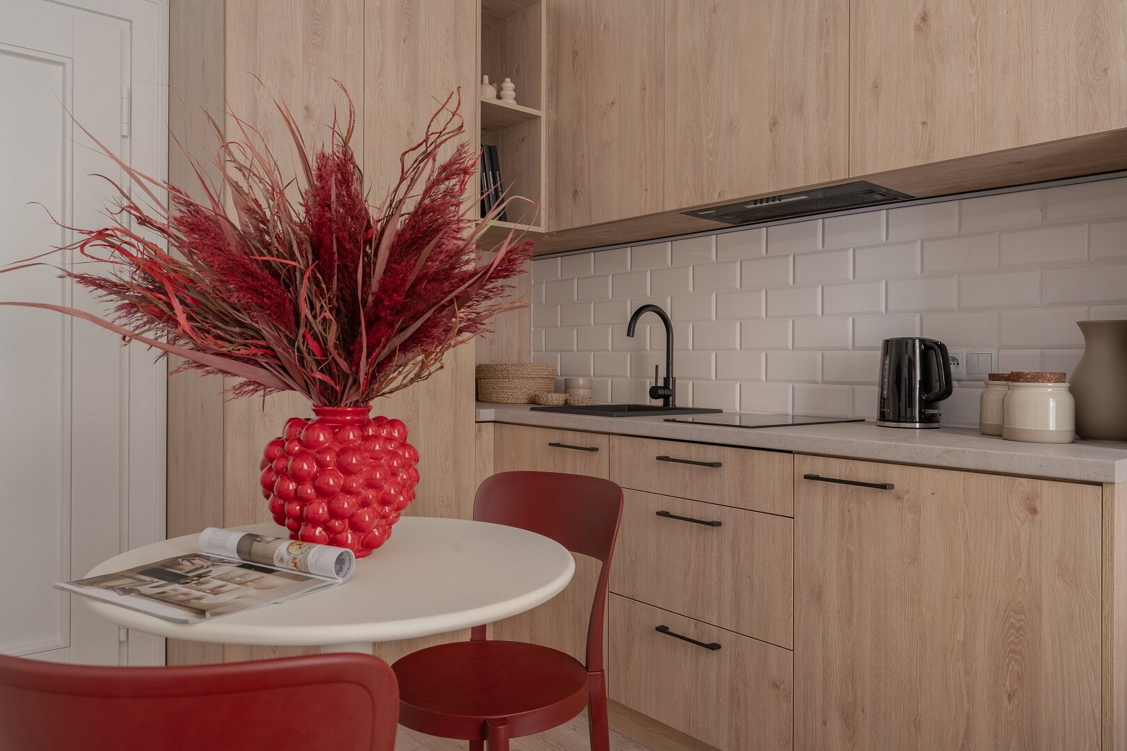 Jasne wnętrze z akcentami w odcieniach beżu i czerwieni wprowadza spokój połączony jednak z nutą energii. W przestronnym pokoju znajdziesz wygodne łóżko z miękkim zagłówkiem, idealne na relaks po dniu pełnym wrażeń. Obok znajduje się część jadalniana z okrągłym stołem – idealna na poranną kawę lub romantyczną kolację we dwoje. Nowoczesny aneks kuchenny został w pełni wyposażony, abyś mógł poczuć się jak w domu – jest tu ekspres do kawy Nespresso, czajnik, płyta grzewcza i niezbędne naczynia.