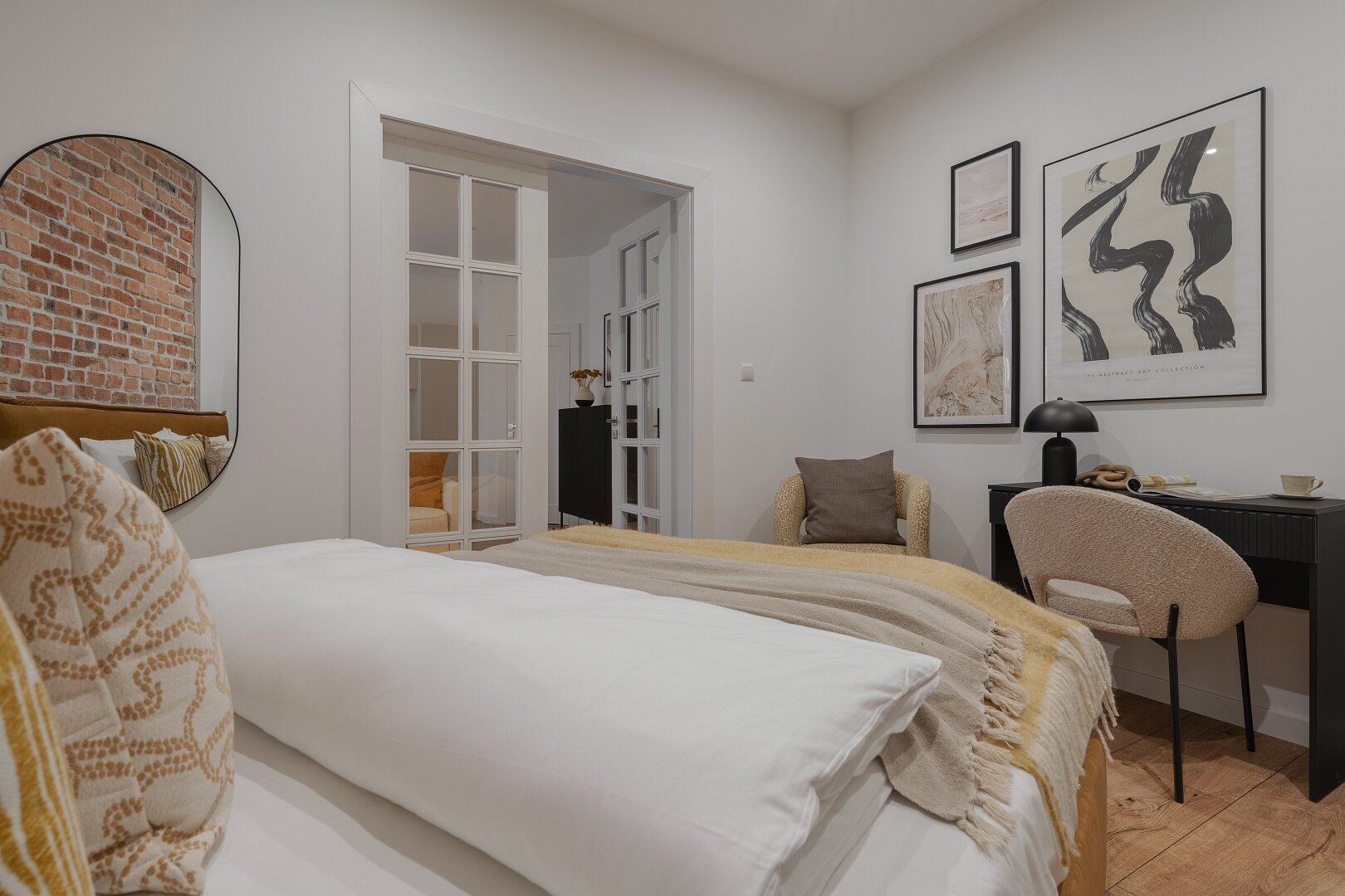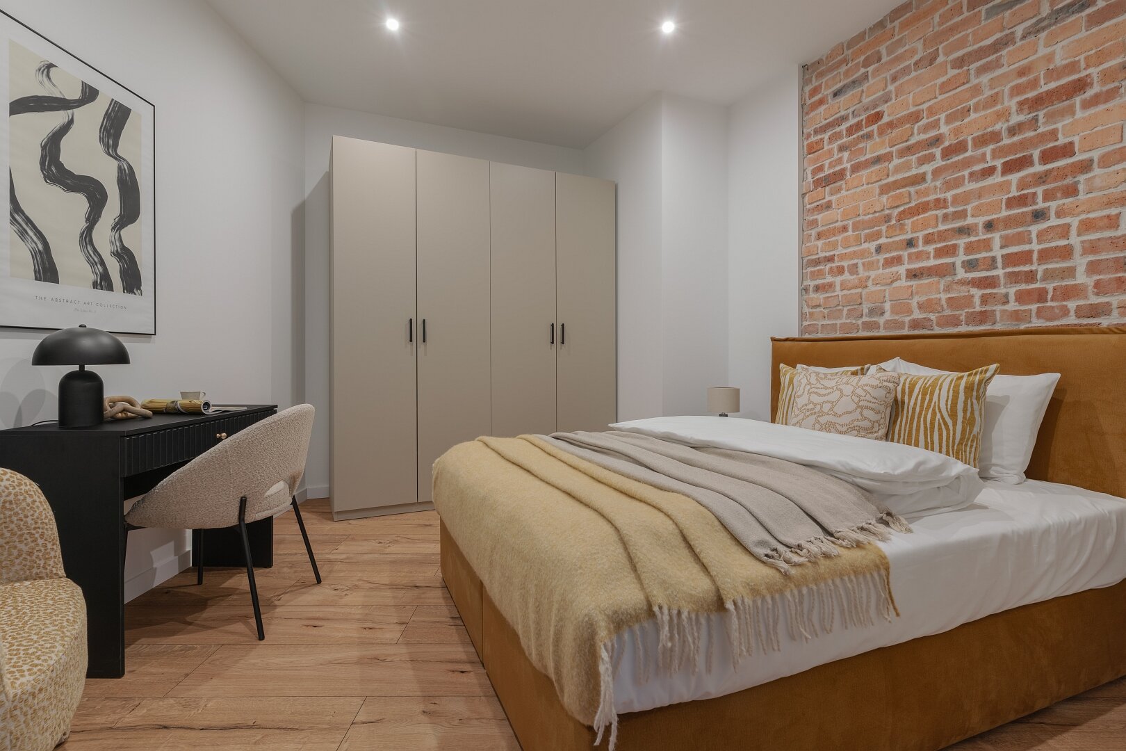 Niemal monochromatyczny apartament gdyby nie czerwone akcenty nadające temperamentu. Jeden z nielicznych wyposażony w klasyczne, podwójne łóżko.